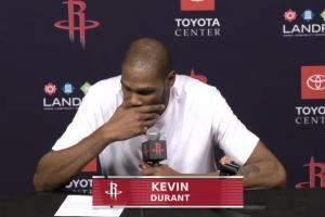 赛后,杜兰特参加新闻发布会,接受了记者的采访。